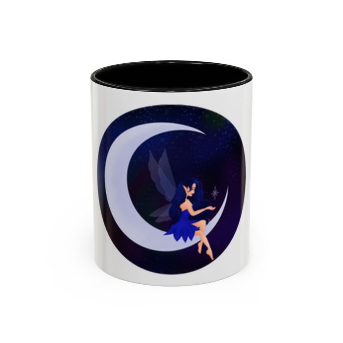 A moonlit mug that turns quiet mornings into a small ritual. A delicate fairy perches on a sliver of crescent moon against a deep, starlit navy—soft, whimsical, and just a little mysterious. This ceramic mug’s dark interior and handle echo the night sky, making the illustration pop and inviting you to pause with a warm drink. It slips easily into daily life: a night owl’s companion during late work sessions, a cozy presence on bedside tables, or the gentle accent at a reading nook. The glossy finish brightens the colors, while the comfortable C-handle keeps it familiar and easy to hold.Product features- Microwave-safe ceramic for easy reheats- Dishwasher-safe with vibrant, long-lasting print- Available in 11oz and 15oz with colored interior and handle- Glossy white exterior with eye-catching color contrast- Lead- and BPA-free, comfortable C-shaped handleCare instructions- Clean in dishwasher or wash by hand with warm water and dish soap